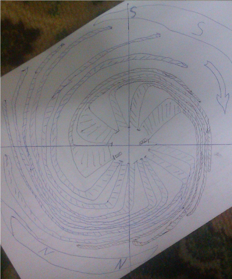 По рисунку видно: черной ручкой обмотки верхних ламелей, синей ручкой - обмотки нижних ламелей. Вертикальная ось - расположение катушек статора, щетки немножко смещены по отношению горизонтальной оси.